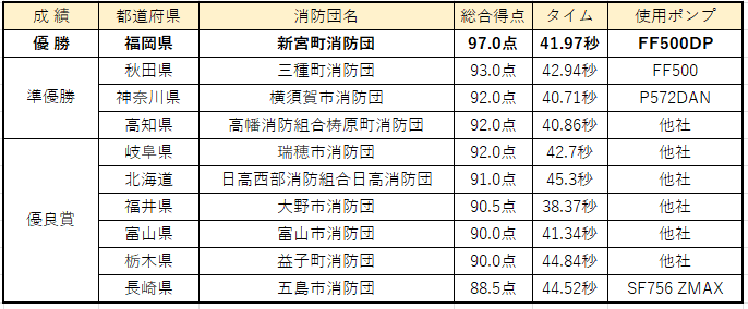 入賞されたチームの皆様おめでとうございました。 また、大会に出場された皆様、出場に向けて練習を重ねた全国の消防団の皆様、長い間お疲れ様でした。